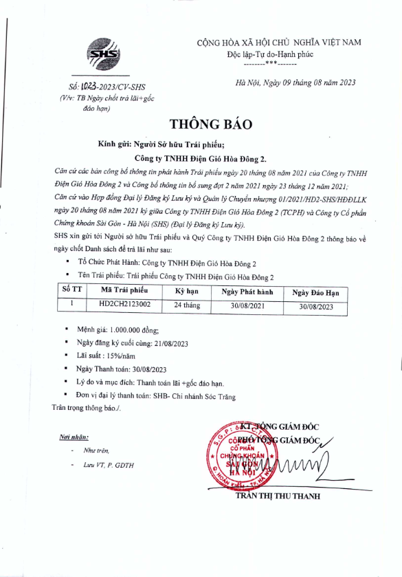 Thông báo v/v Trả lãi định kỳ Trái phiếu Công ty TNHH Điện Gió Hòa Đông 2