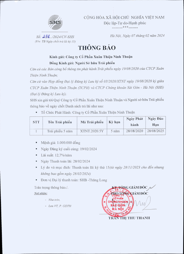 - Thông báo v/v Trả lãi định kỳ Trái phiếu Công ty Cổ Phần Xuân Thiện Ninh Thuận - 19/02/2024