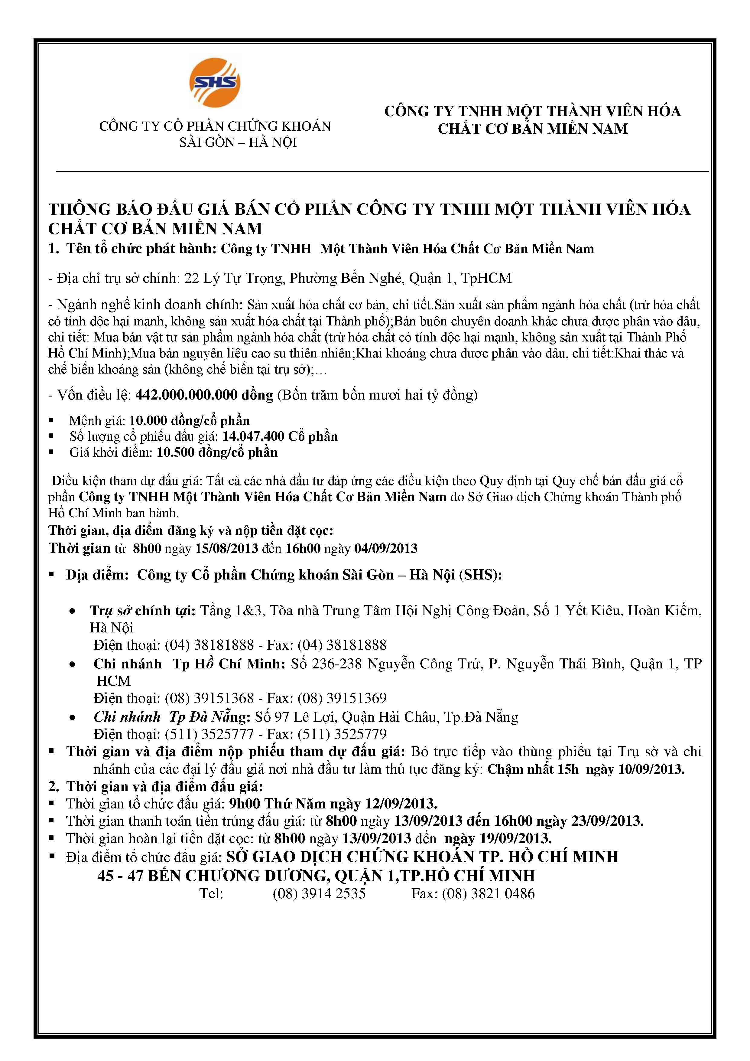 Thông báo đấu giá bán cổ phần Công ty TNHH một thành viên Hóa Chất Cơ Bản Miền Nam