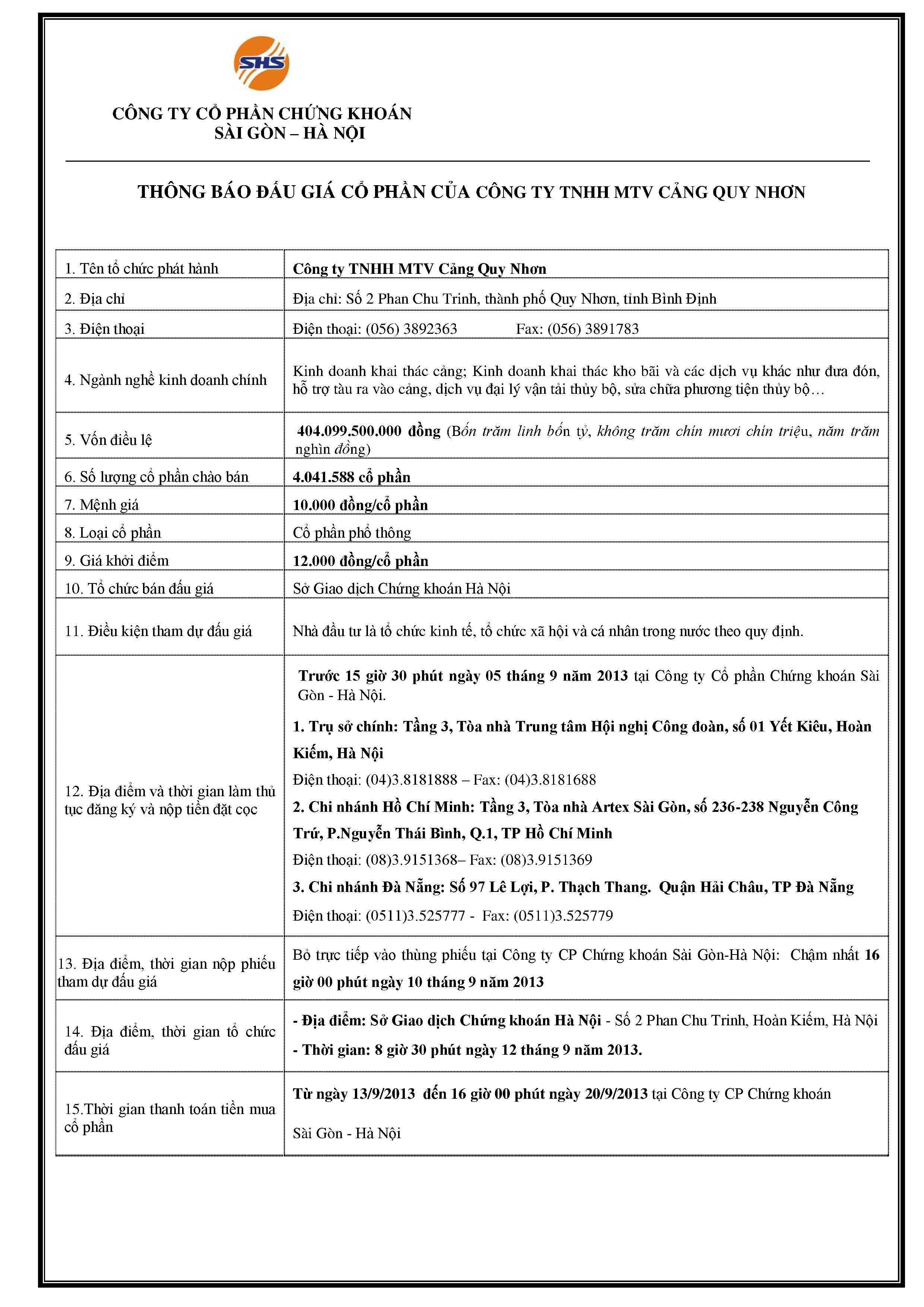 Thông báo đấu giá cổ phần của Công ty TNHH MTV Cảng Quy Nhơn