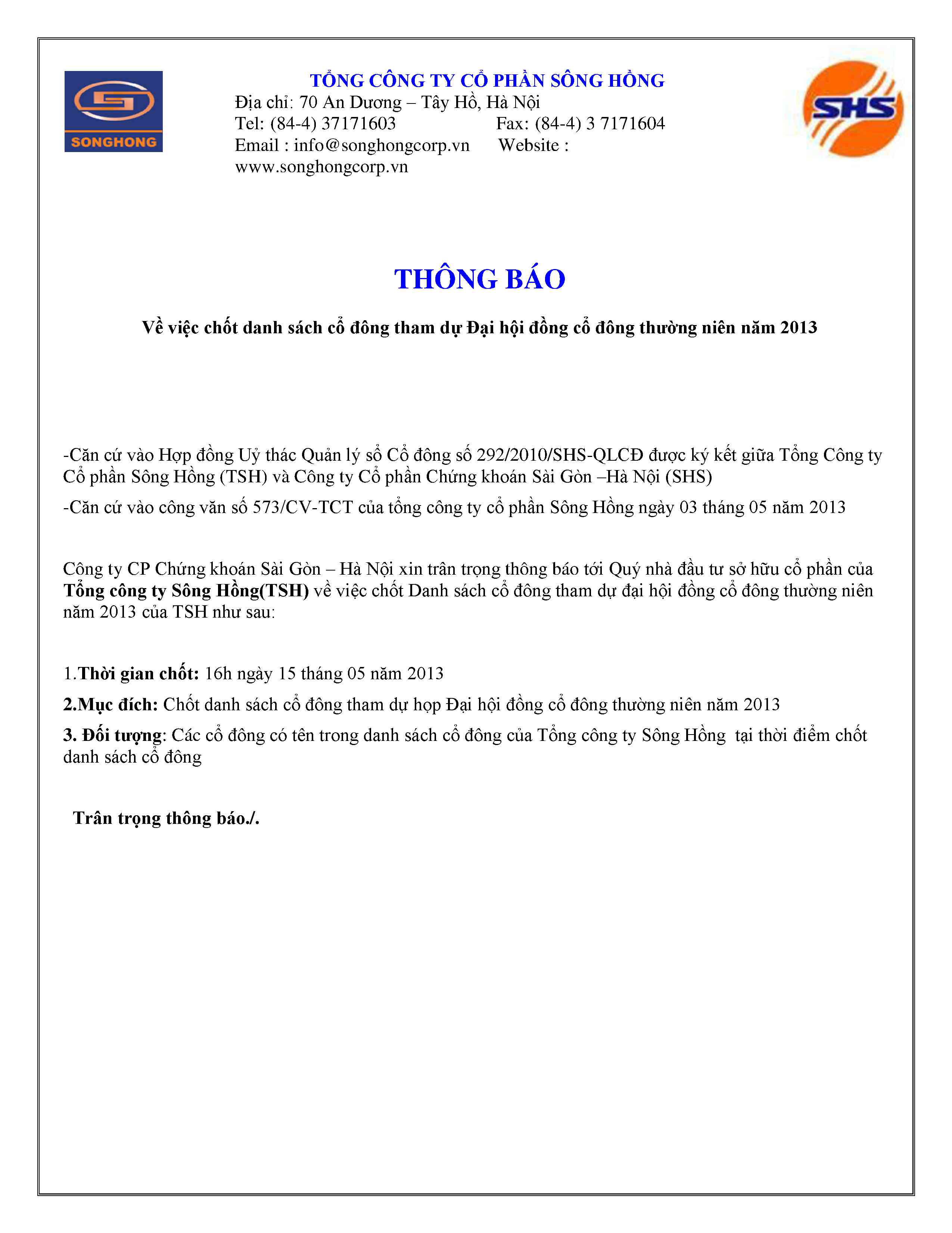 Thông báo về việc chốt danh sách cổ đông Tổng Công ty Cổ phần Sông Hồng (TSH) tham dự Đại hội đồng cổ đông thường niên năm 2013