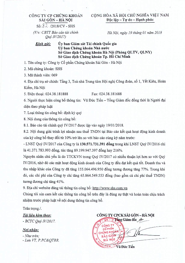 SHS: CBTT Báo cáo tài chính quý IV.2017