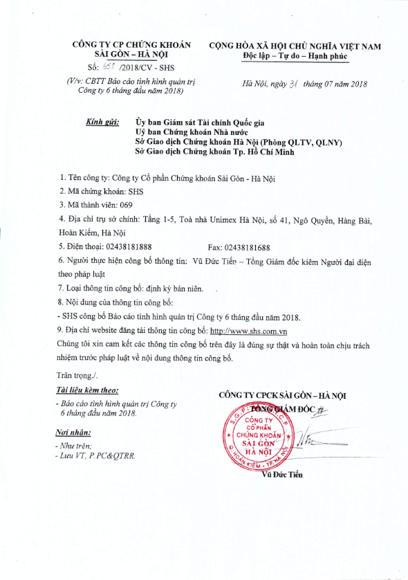 SHS: CBTT Báo cáo tình hình quản trị công ty 6 tháng đầu năm 2018