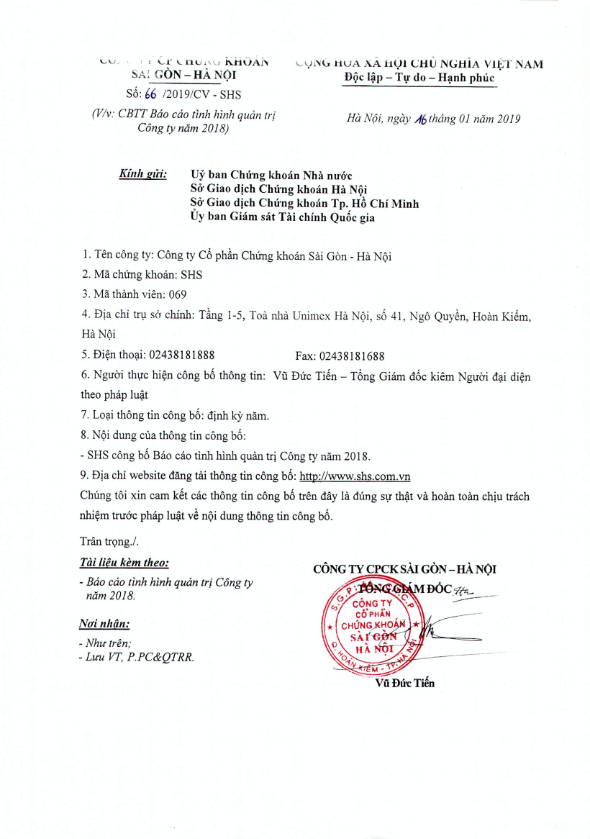 SHS: CBTT Báo cáo tình hình quản trị công ty năm 2018