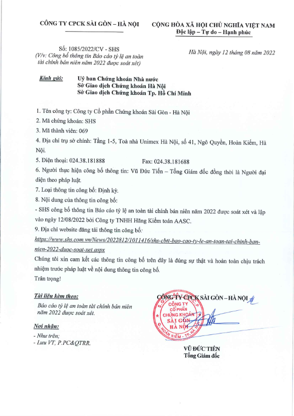 SHS : CBTT Báo cáo tỷ lệ an toàn tài chính bán niên 2022 được soát xét