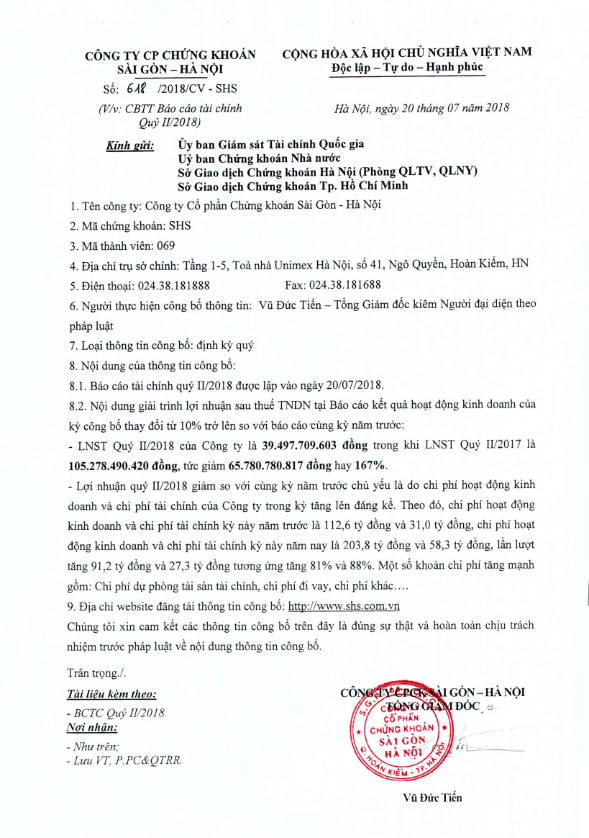 SHS: Công bố Báo cáo tài chính quý II.2018