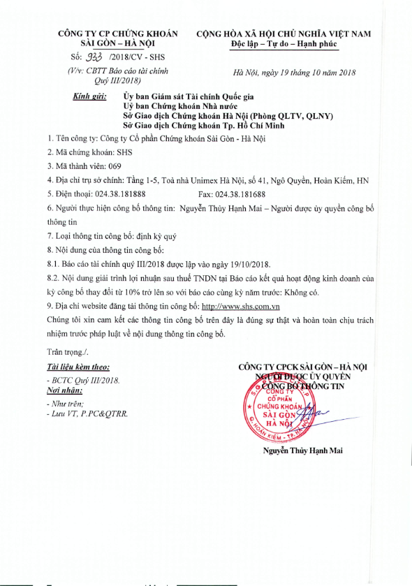 SHS: Công bố Báo cáo tài chính quý III.2018
