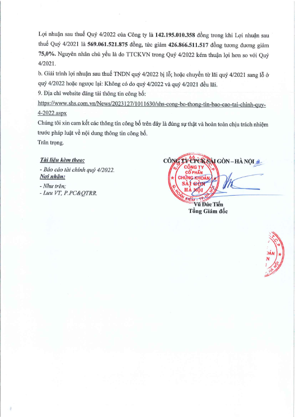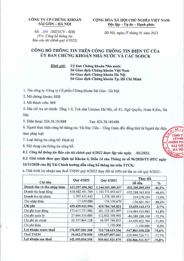 SHS: Công bố thông tin Báo cáo tài chính quý 4.2022