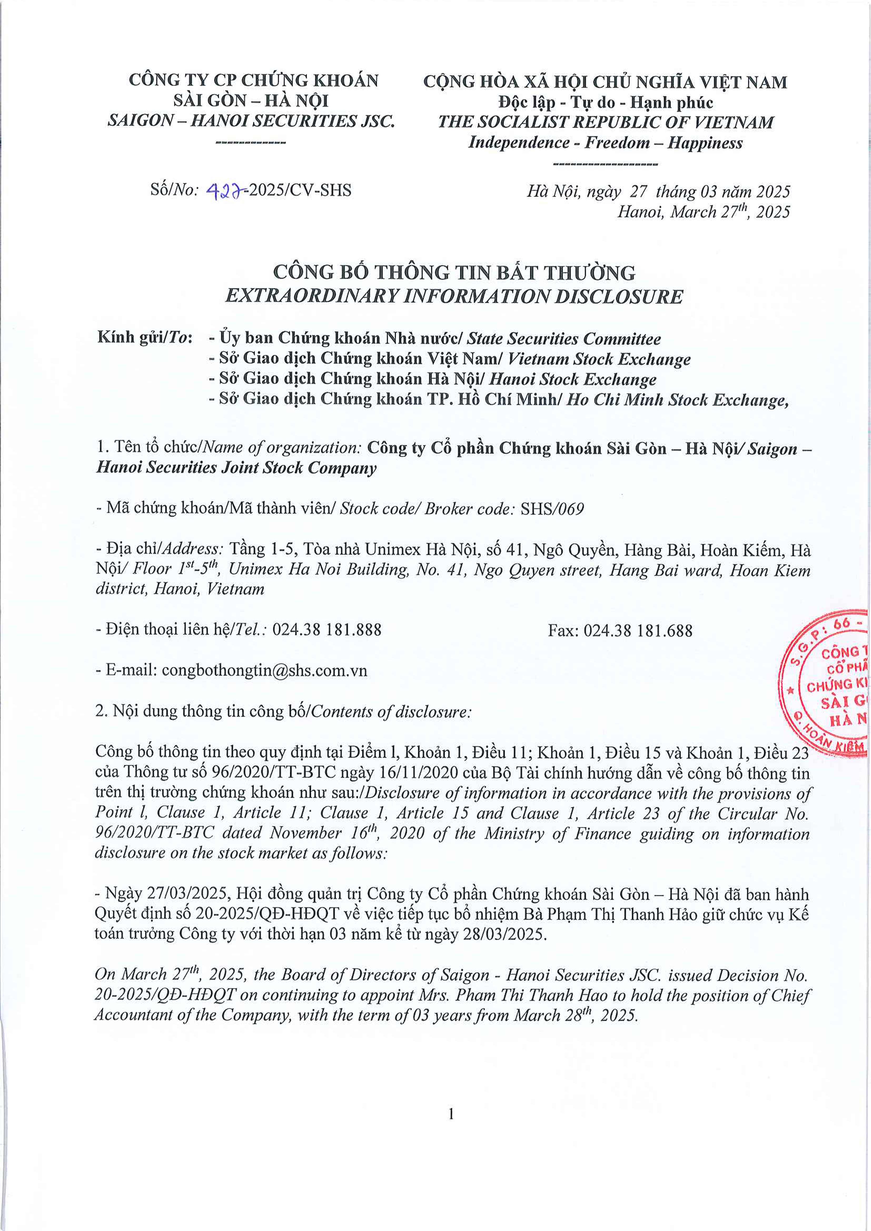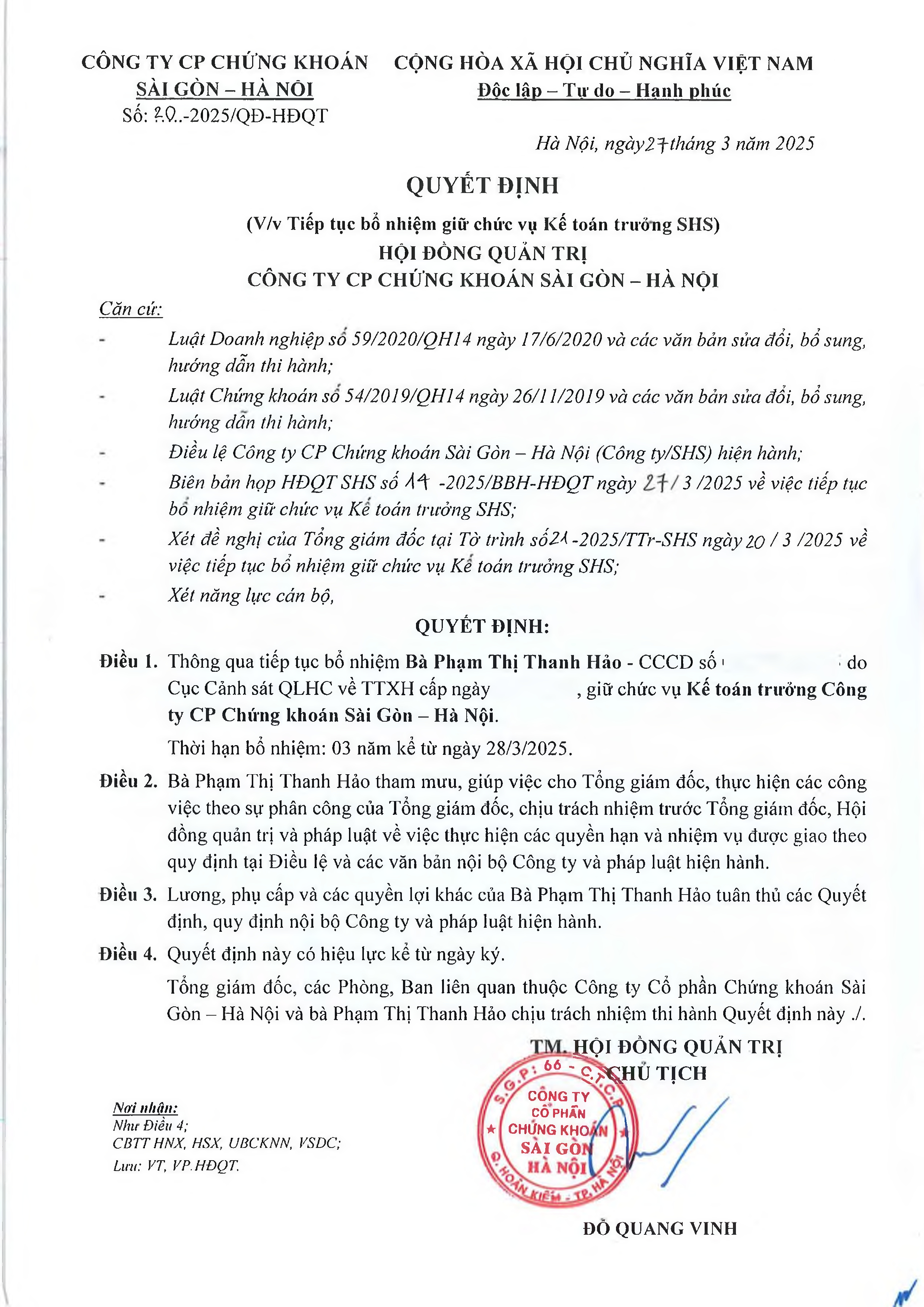 CBTT: SHS tiếp tục bổ nhiệm bà Phạm Thị Thanh Hảo giữ chức vụ Kế toán trưởng