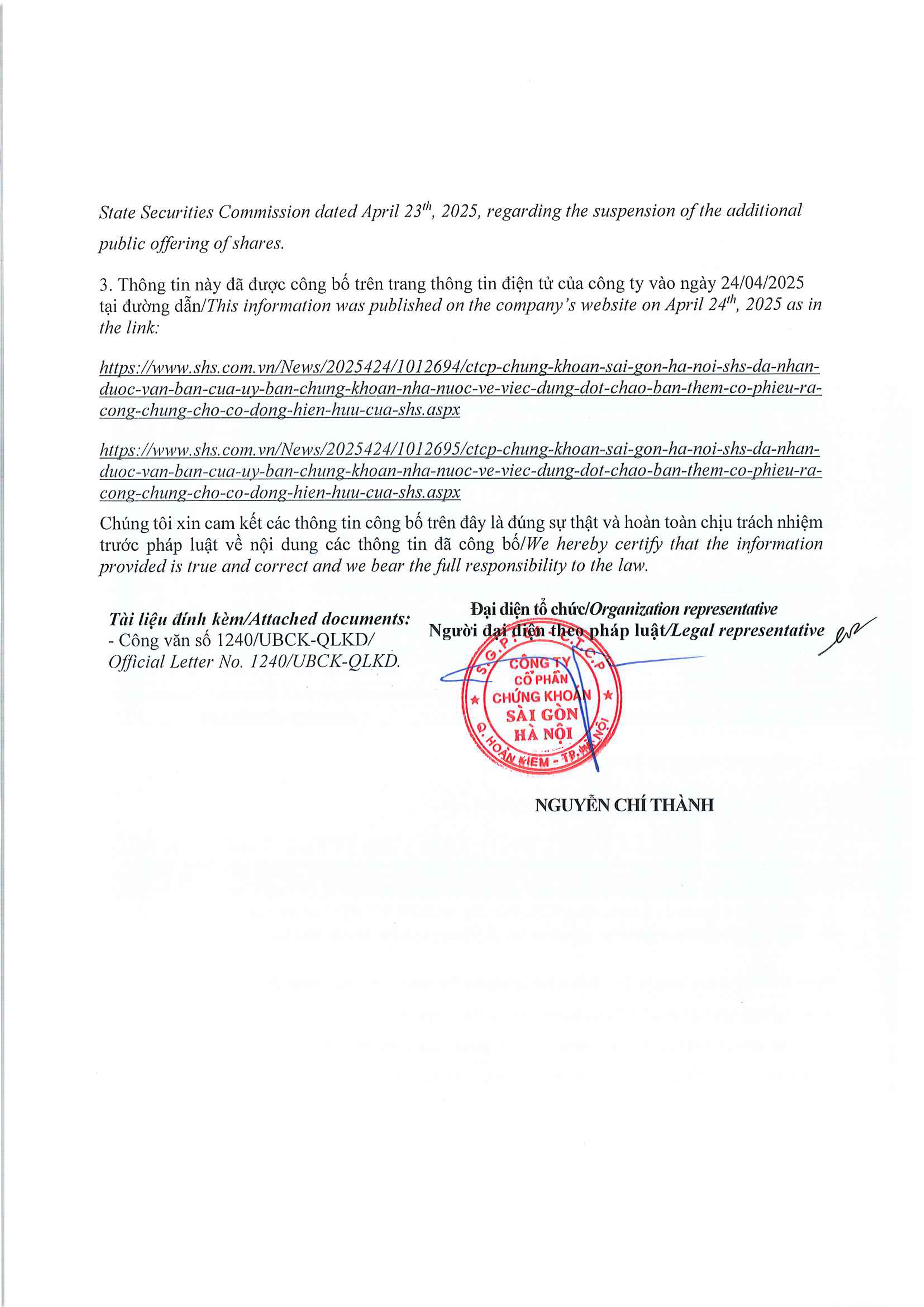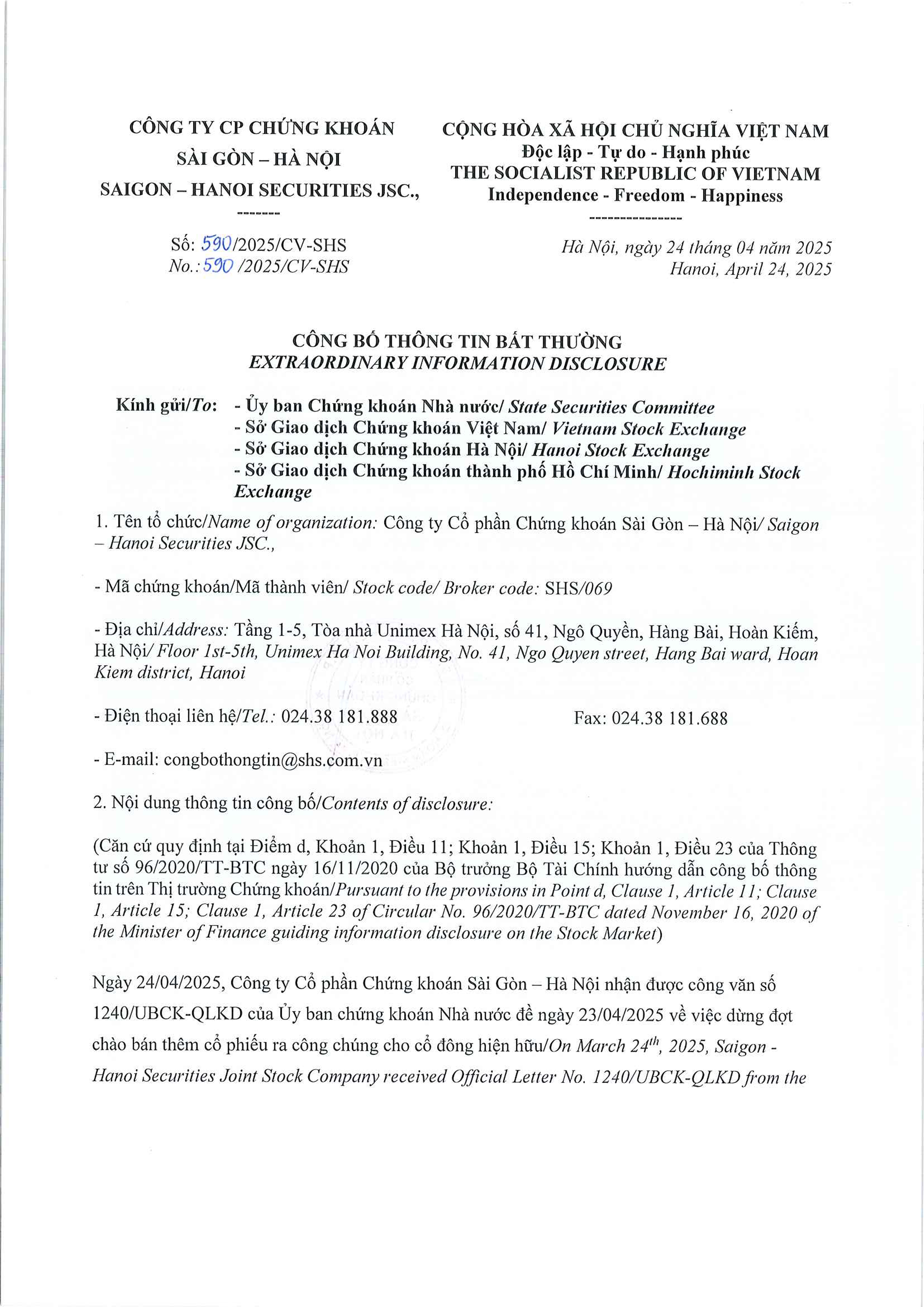 CTCP Chứng khoán Sài Gòn - Hà Nội (SHS) đã nhận được văn bản của Ủy ban Chứng khoán Nhà nước về việc dừng đợt Chào bán thêm cổ phiếu ra công chúng cho cổ đông hiện hữu của SHS