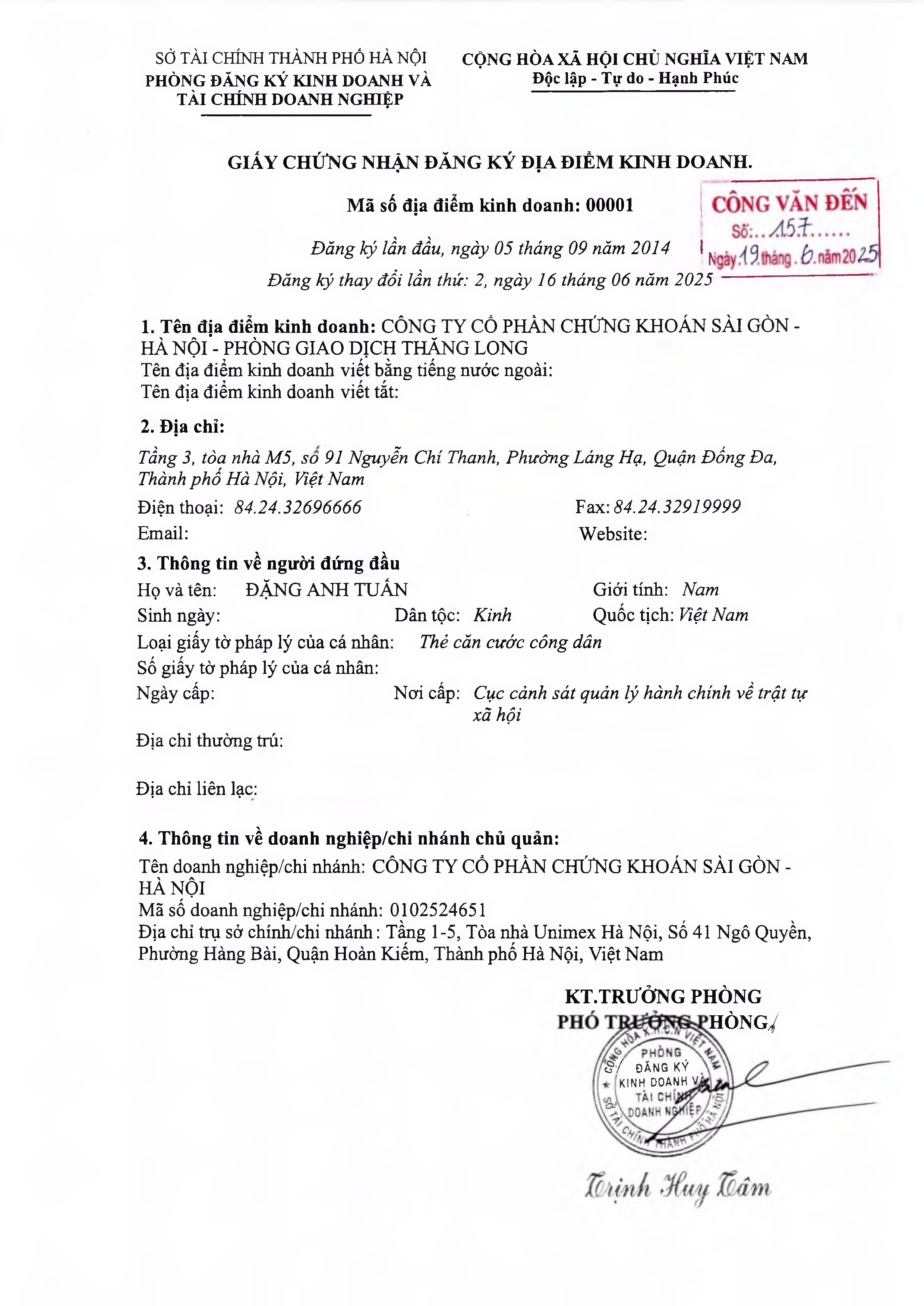 SHS: CBTT Giấy chứng nhận đăng ký địa điểm kinh doanh Phòng Giao dịch Thăng Long