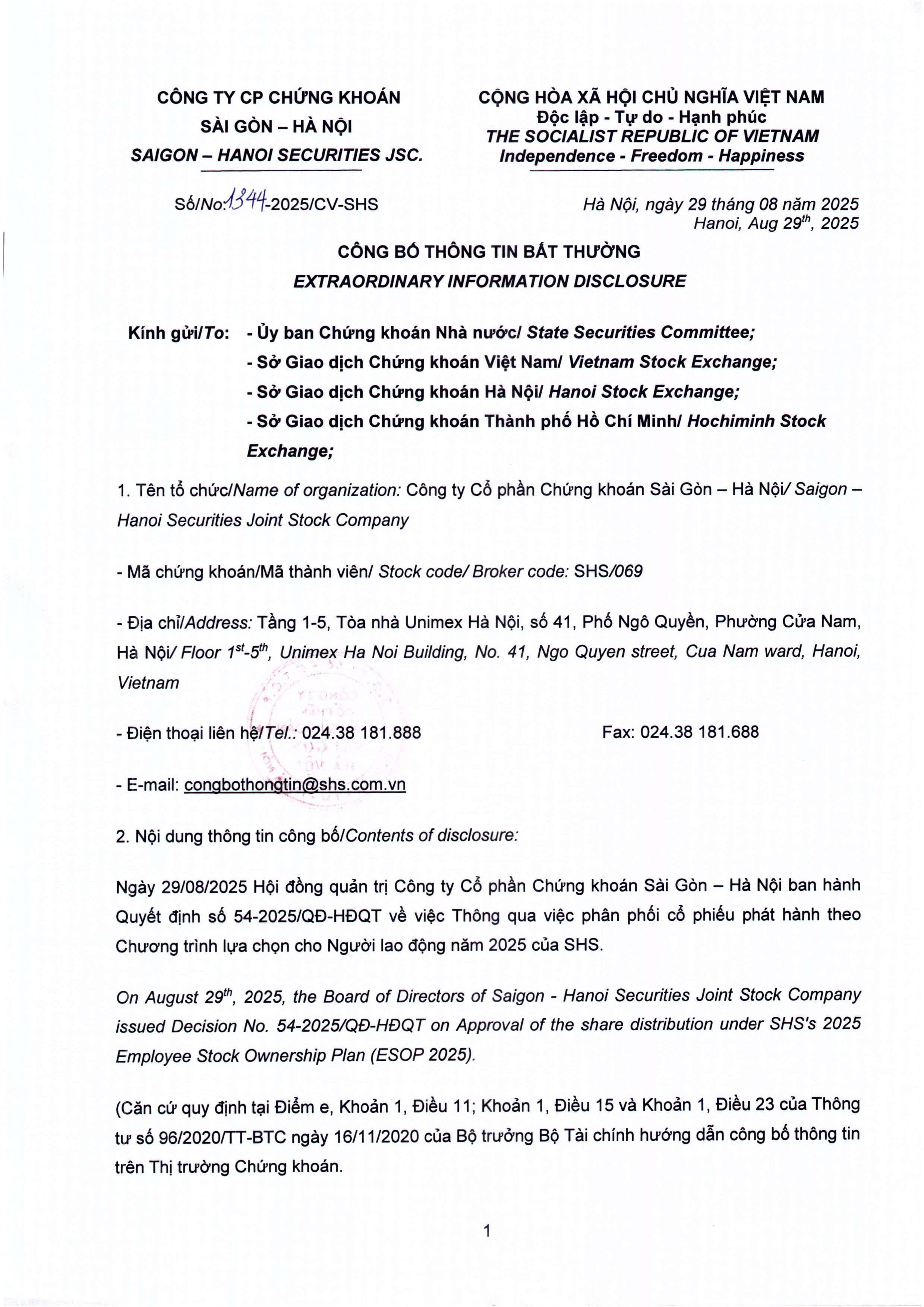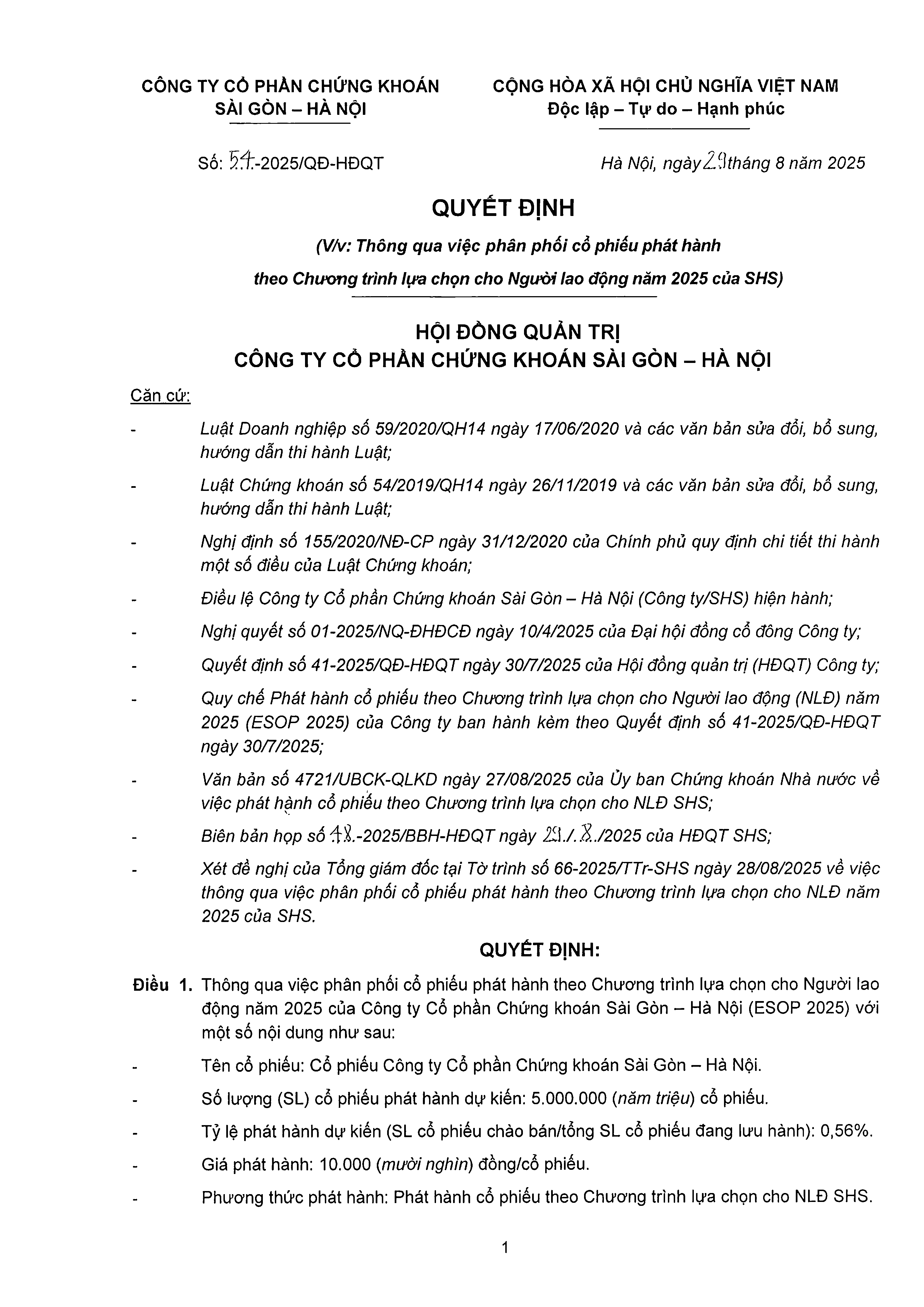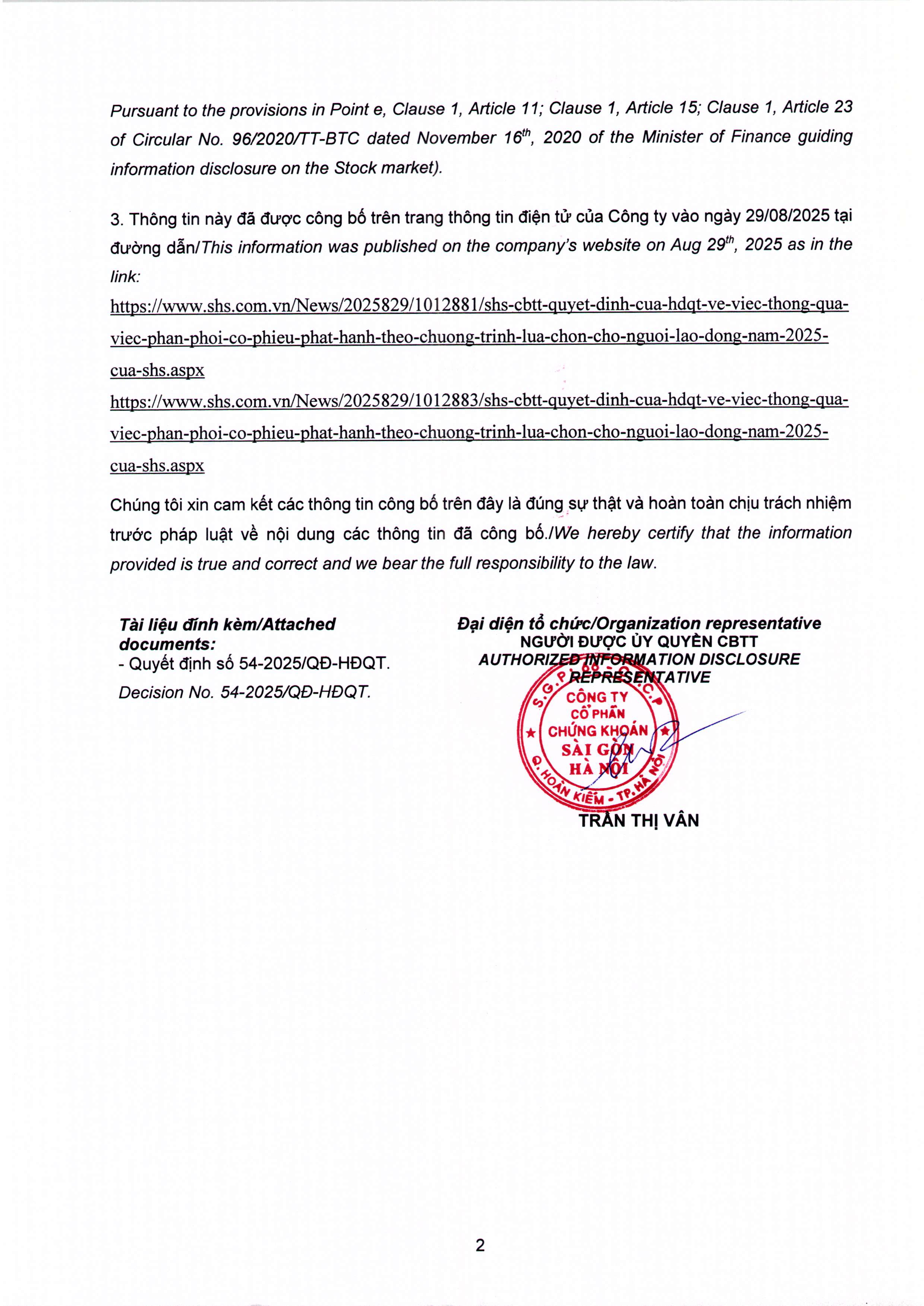SHS CBTT quyết định của HĐQT về việc Thông qua việc phân phối cổ phiếu phát hành theo Chương trình lựa chọn cho Người lao động năm 2025 của SHS