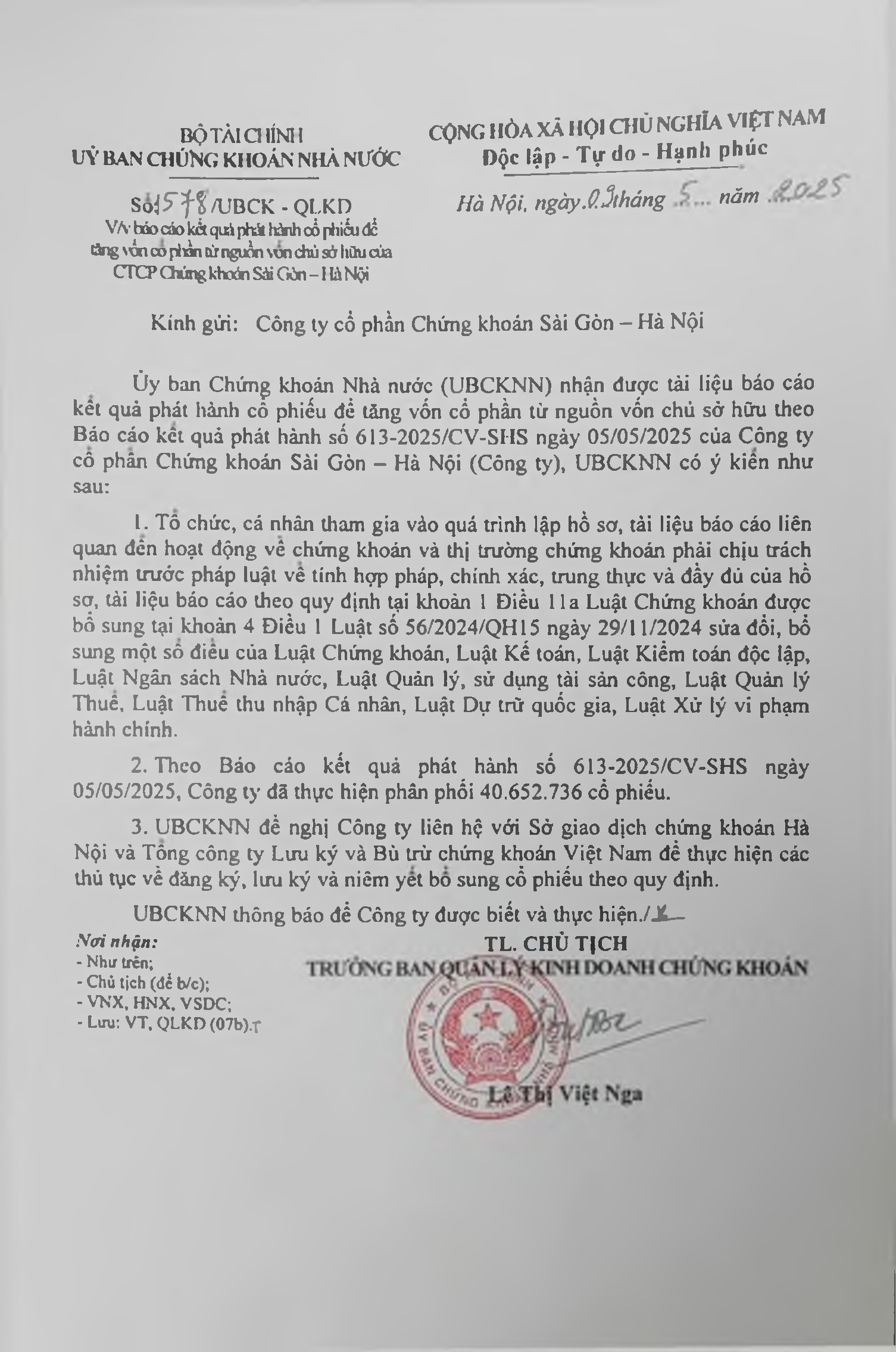- SHS đã nhận được văn bản của UBCKNN về báo cáo kết quả phát hành cổ phiếu trả cổ tức năm 2023