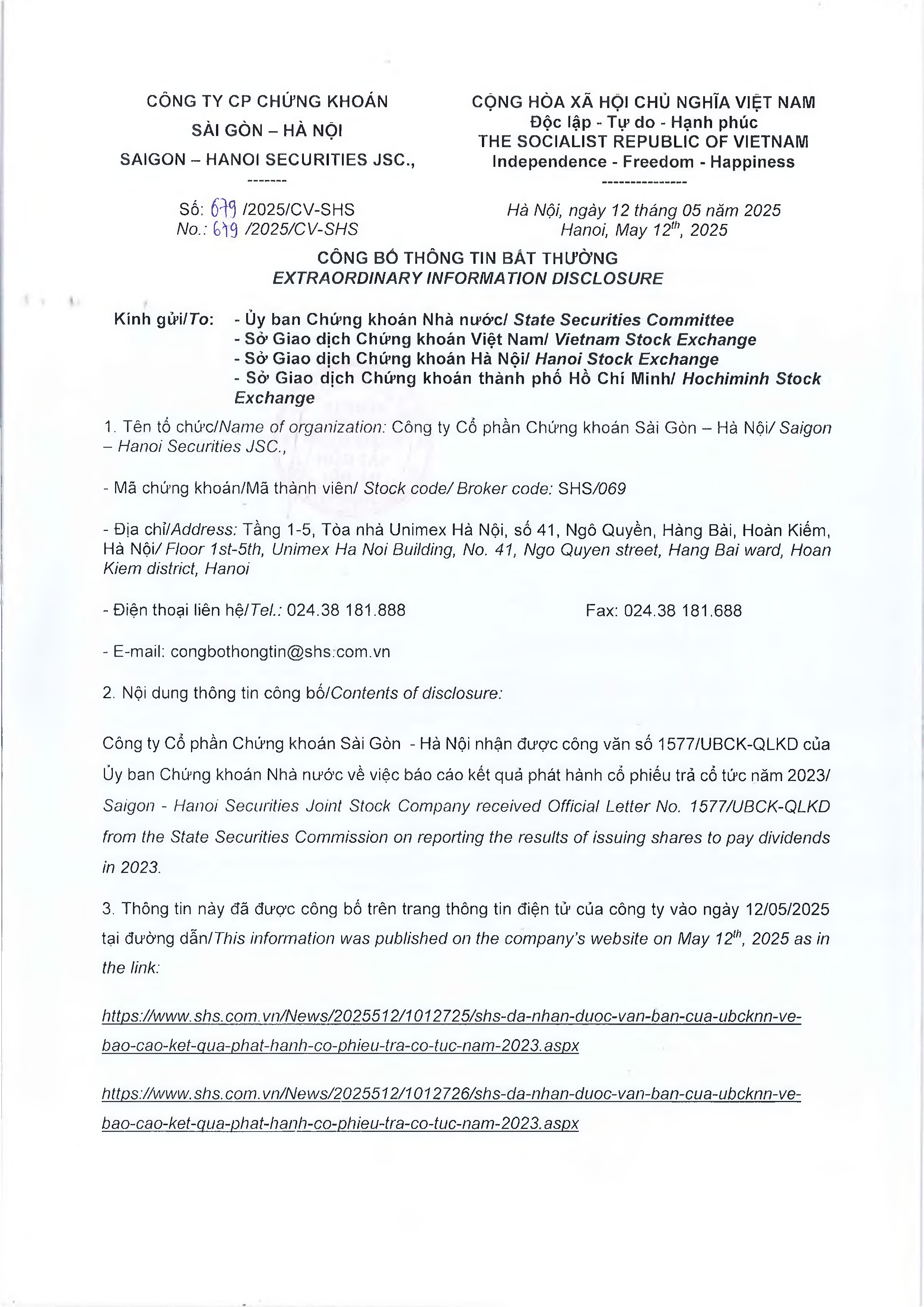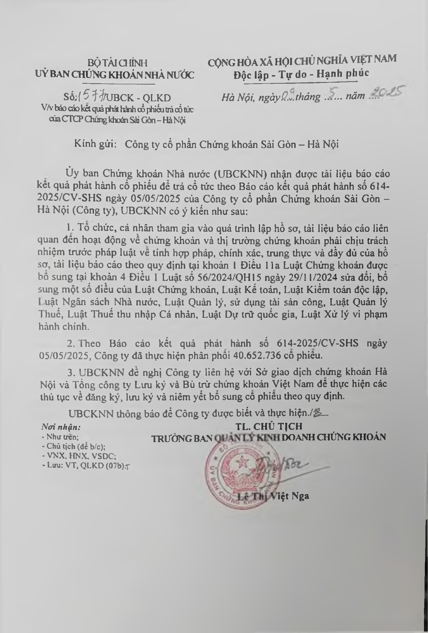 SHS đã nhận được văn bản của UBCKNN về báo cáo kết quả phát hành cổ phiếu trả cổ tức năm 2023