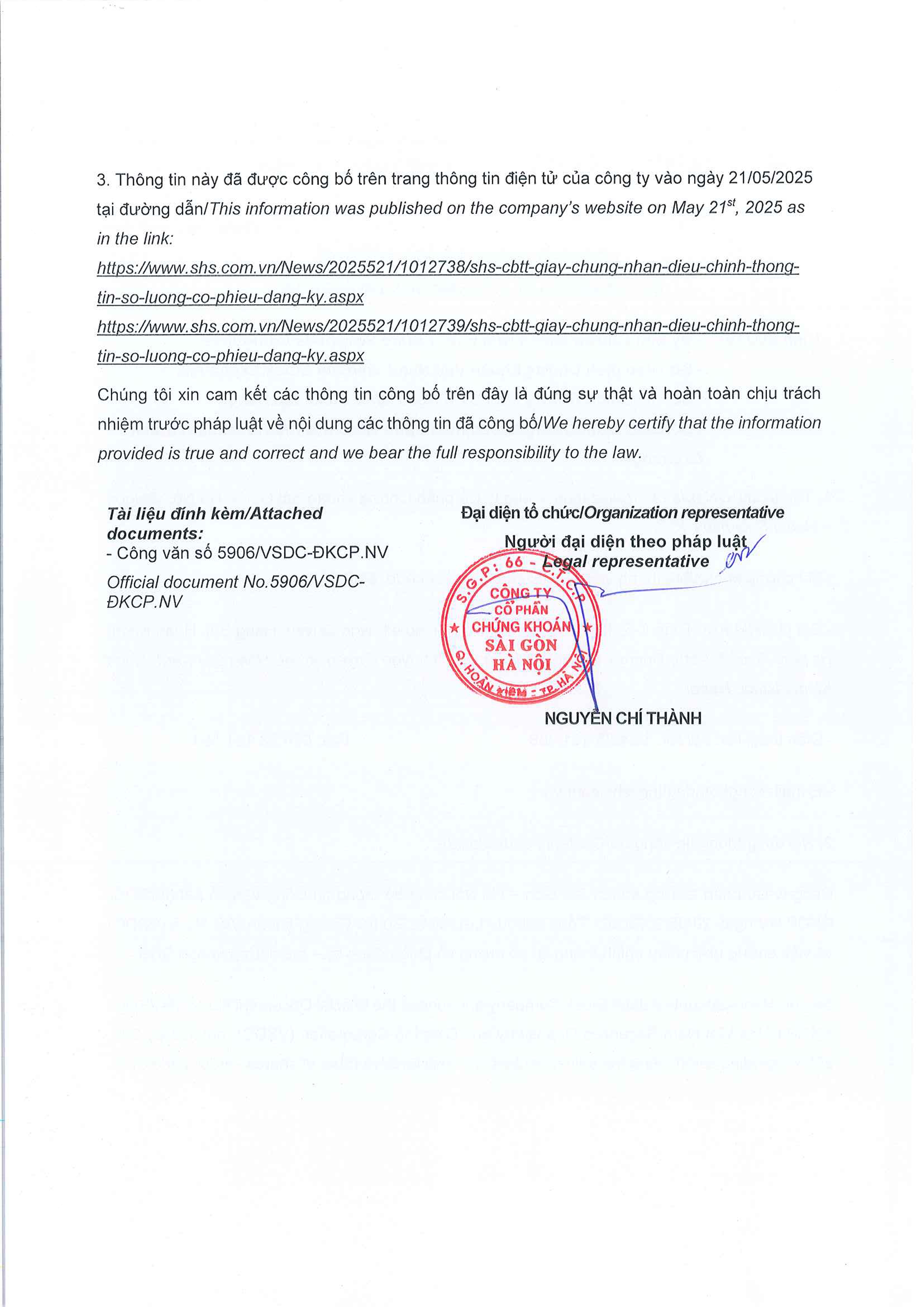 SHS đã nhận được văn bản của VSDC V/v chứng nhận điều chỉnh thông tin số lượng cổ phiếu đăng ký – mã chứng khoán SHS