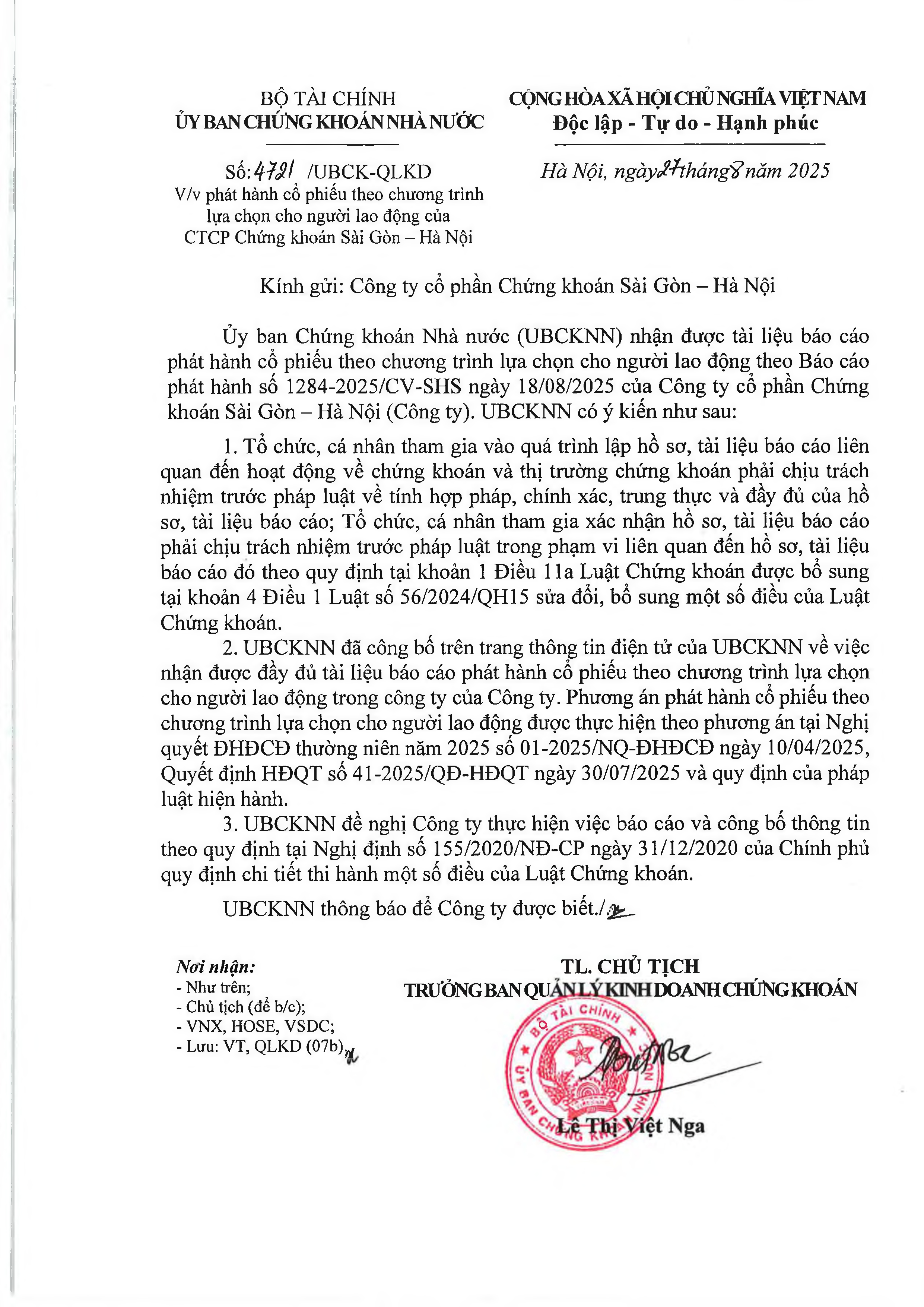 SHS nhận được văn bản của UBCKNN về việc nhận được tài liệu báo cáo phát hành cổ phiếu theo chương trình cho người lao động của SHS