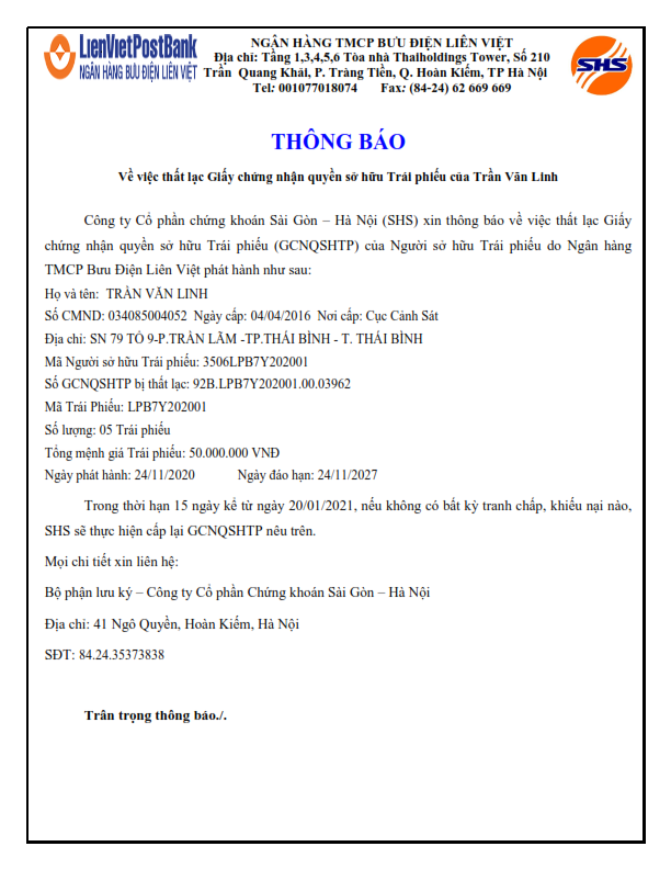 LPB: Thông báo Về việc thất lạc Giấy chứng nhận quyền sở hữu Trái phiếu của Trần Văn Linh