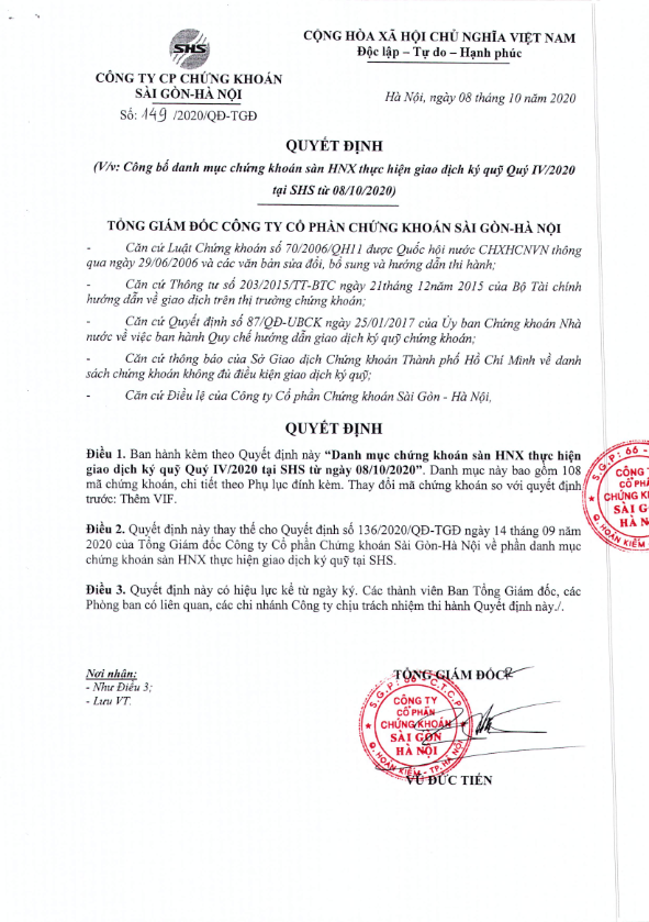 SHS: Thông báo danh mục chứng khoán sàn HNX thực hiện giao dịch ký quỹ quý IV/2020 áp dụng từ ngày 08.10.2020
