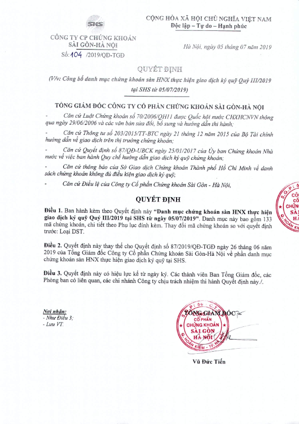 - SHS: Thông báo danh mục chứng khoán thực hiện giao dịch ký quỹ sàn HSX quý 03.2019 áp dụng từ ngày 04.07.2019 - 04/07/2019