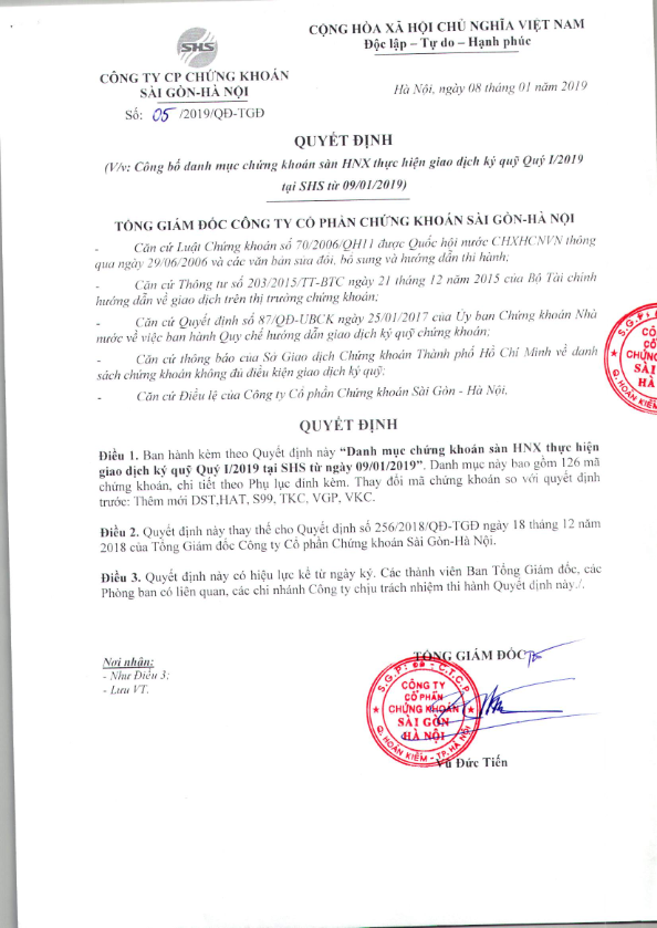 - SHS: Thông báo danh mục chứng khoán thực hiện giao dịch ký quỹ sàn HSX quý 1.2019 áp dụng từ ngày 8.1.2019 - 08/01/2019