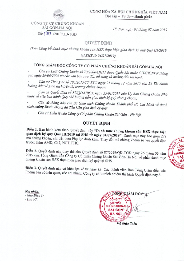 SHS: Thông báo danh mục chứng khoán thực hiện giao dịch ký quỹ sàn HSX quý 03.2019 áp dụng từ ngày 04.07.2019
