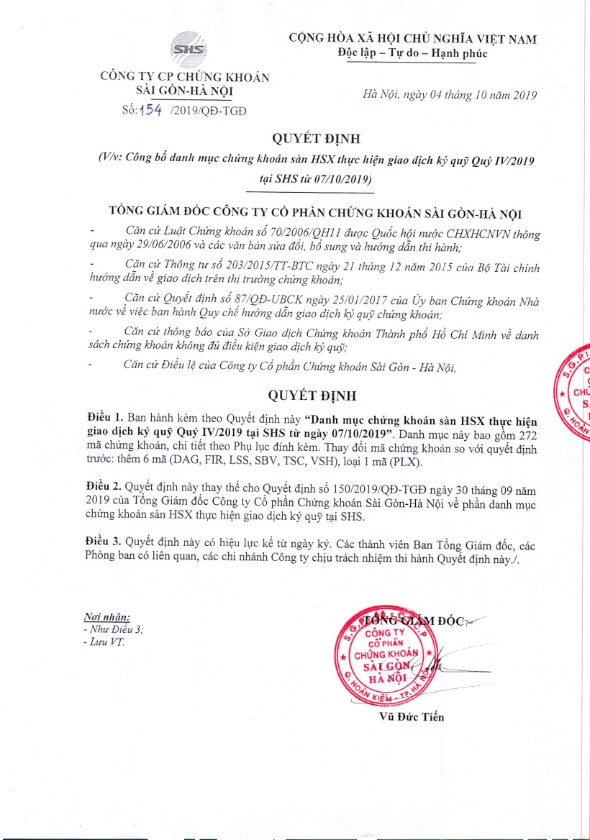 SHS: Thông báo danh mục chứng khoán thực hiện giao dịch ký quỹ sàn HSX quý 04.2019 áp dụng từ ngày 07.10.2019