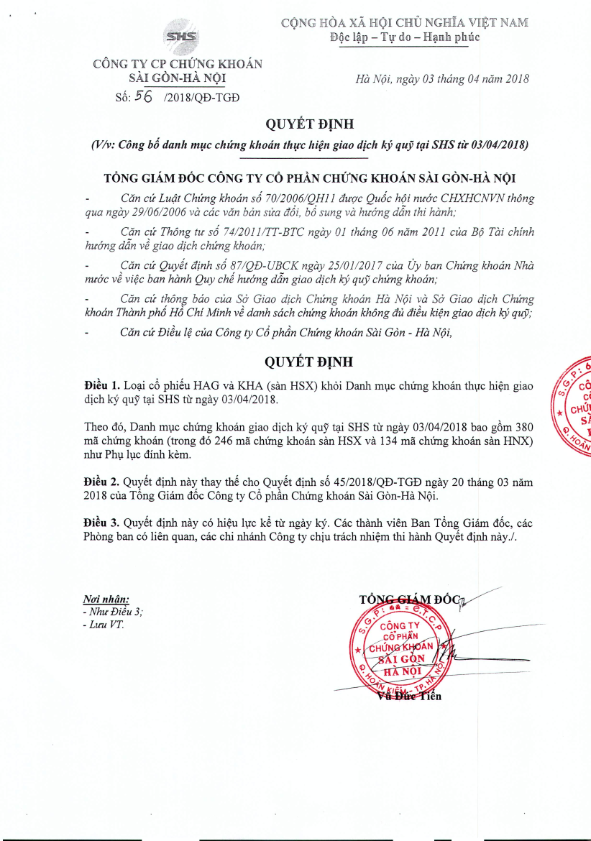 SHS: Thông báo loại HAG và KHA (sàn HSX) ra khỏi DM chứng khoán ký quỹ từ ngày 3/4/2018