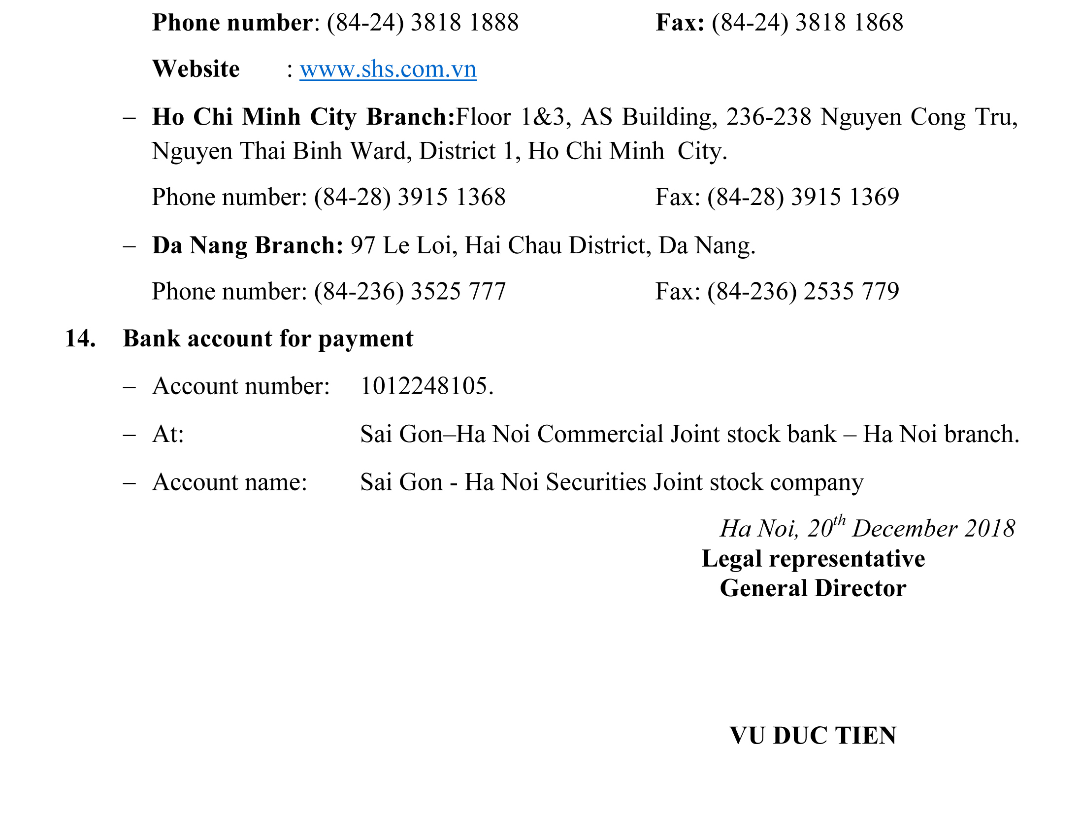 Văn phòng Hội đồng Quản trị SHS – Tầng 5 - Tòa nhà UNIMEX số 41 Ngô Quyền, Hàng Bài, Hoàn Kiếm, Hà Nội