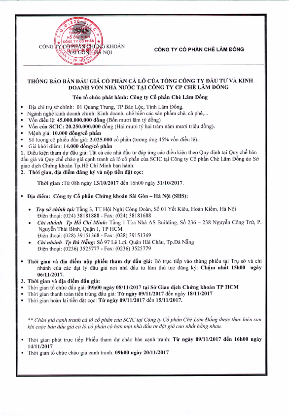 Thông báo bán đấu giá cả lô cổ phần của Công ty Cổ phần Chè Lâm Đồng do Tổng Công ty Đầu tư và Kinh doanh vốn Nhà nước nắm giữ