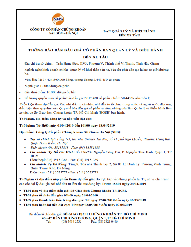 Thông báo bán đấu giá cổ phần Ban quản lý và điều hành Bến Xe Tàu