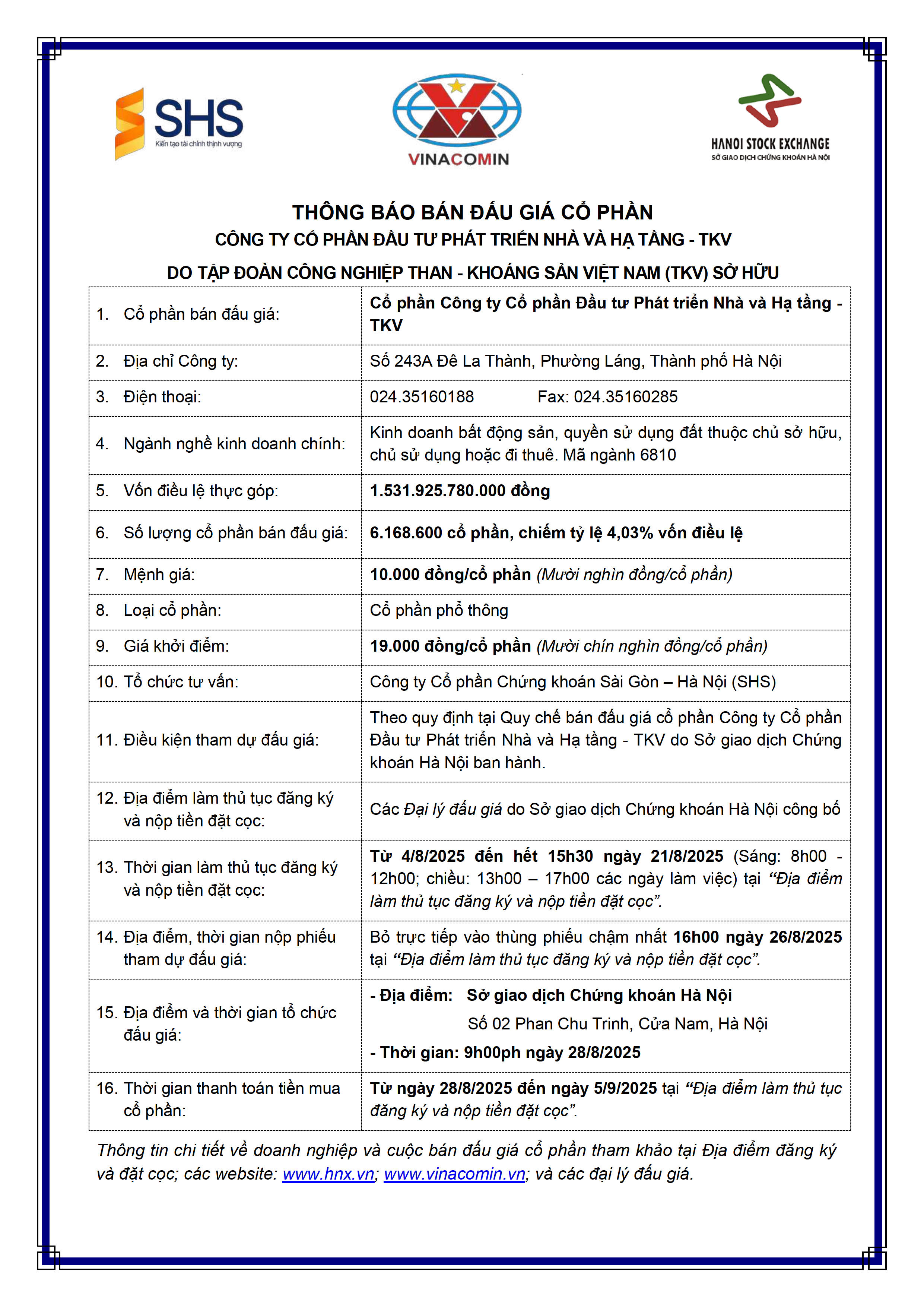 Thông báo bán đấu giá cổ phần CTCP Đầu tư Phát triển Nhà và Hạ tầng – TKV do TKV sở hữu