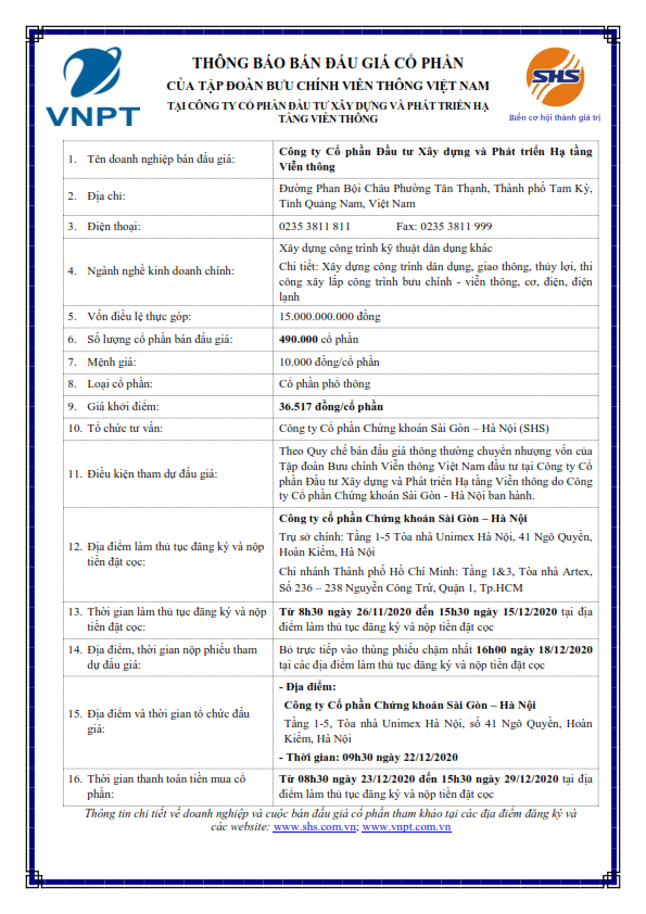 Thông báo bán đấu giá cổ phần CTCP Đầu tư Xây dựng và Phát triển Hạ tầng Viễn thông thuộc sở hữu của Tập đoàn Bưu chính Viễn thông Việt Nam (VNPT)