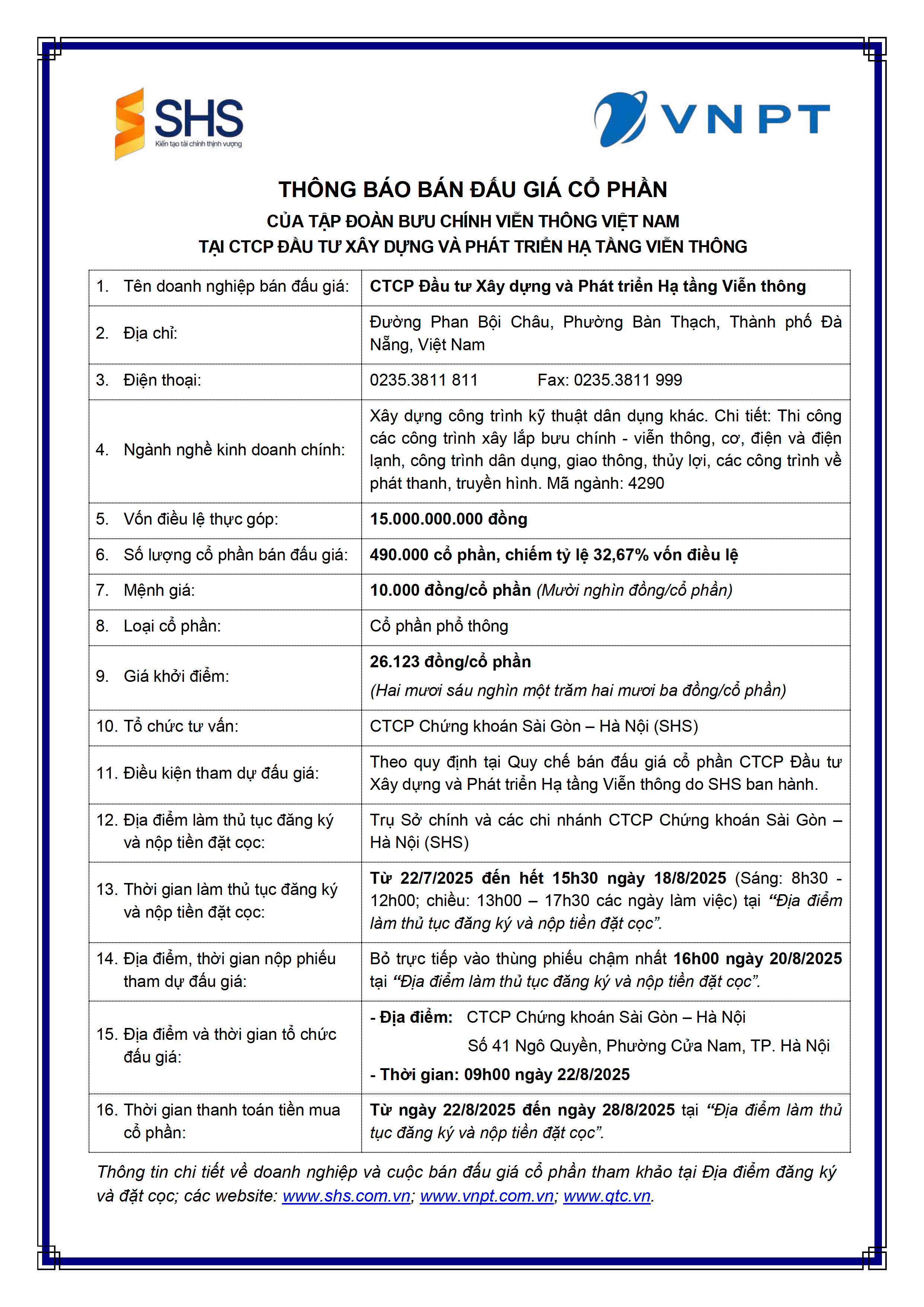 Thông báo bán đấu giá cổ phần CTCP Đầu tư Xây dựng và Phát triển Hạ tầng Viễn thông thuộc sở hữu của VNPT