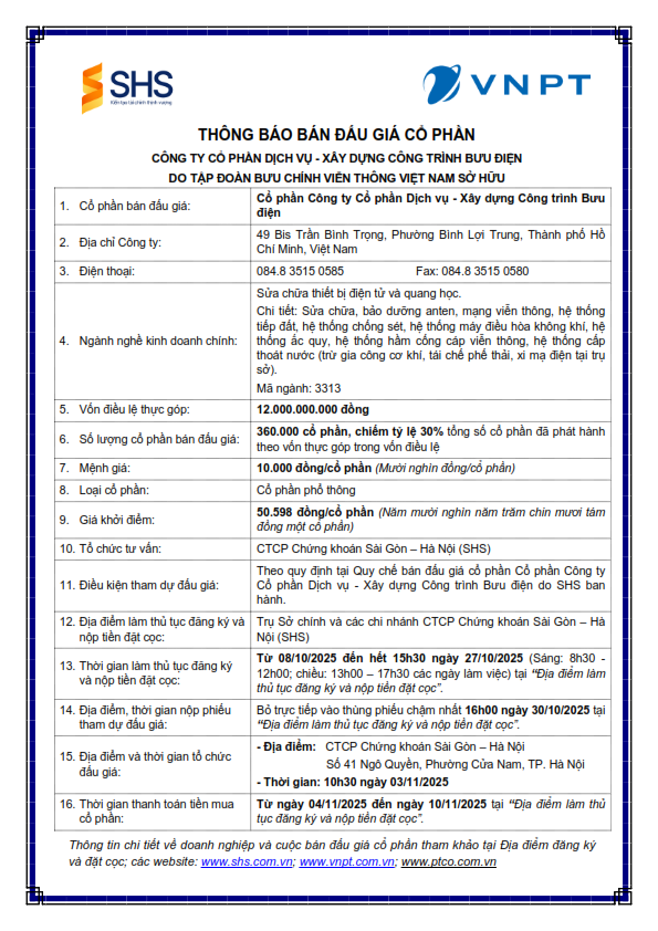 Thông báo bán đấu giá cổ phần CTCP Dịch vụ - Xây dựng Công trình Bưu điện do Tập đoàn Bưu chính viễn thông Việt Nam sở hữu
