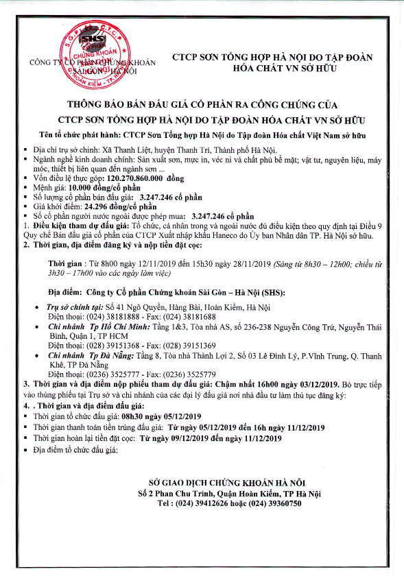- Thông báo bán đấu giá cổ phần CTCP Sơn Tổng hợp Hà Nội do Tập đoàn Hóa chất Việt Nam sở hữu - 12/11/2019