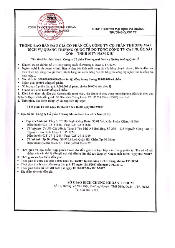 Thông báo bán đấu giá cổ phần CTCP Thương mại dịch vụ Quảng trường quốc tế do TCT Cấp nước Sài Gòn - TNHH MTV nắm giữ