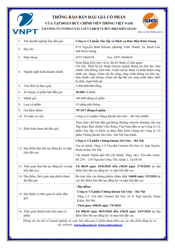 Thông báo bán đấu giá cổ phần CTCP Xây lắp và Dịch vụ Bưu điện Kiên Giang thuộc sở hữu của Tập đoàn Bưu chính Viễn thông Việt Nam (VNPT)