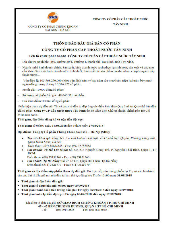 Thông báo bán đấu giá cổ phần của Công ty Cổ phần Cấp thoát nước Tây Ninh