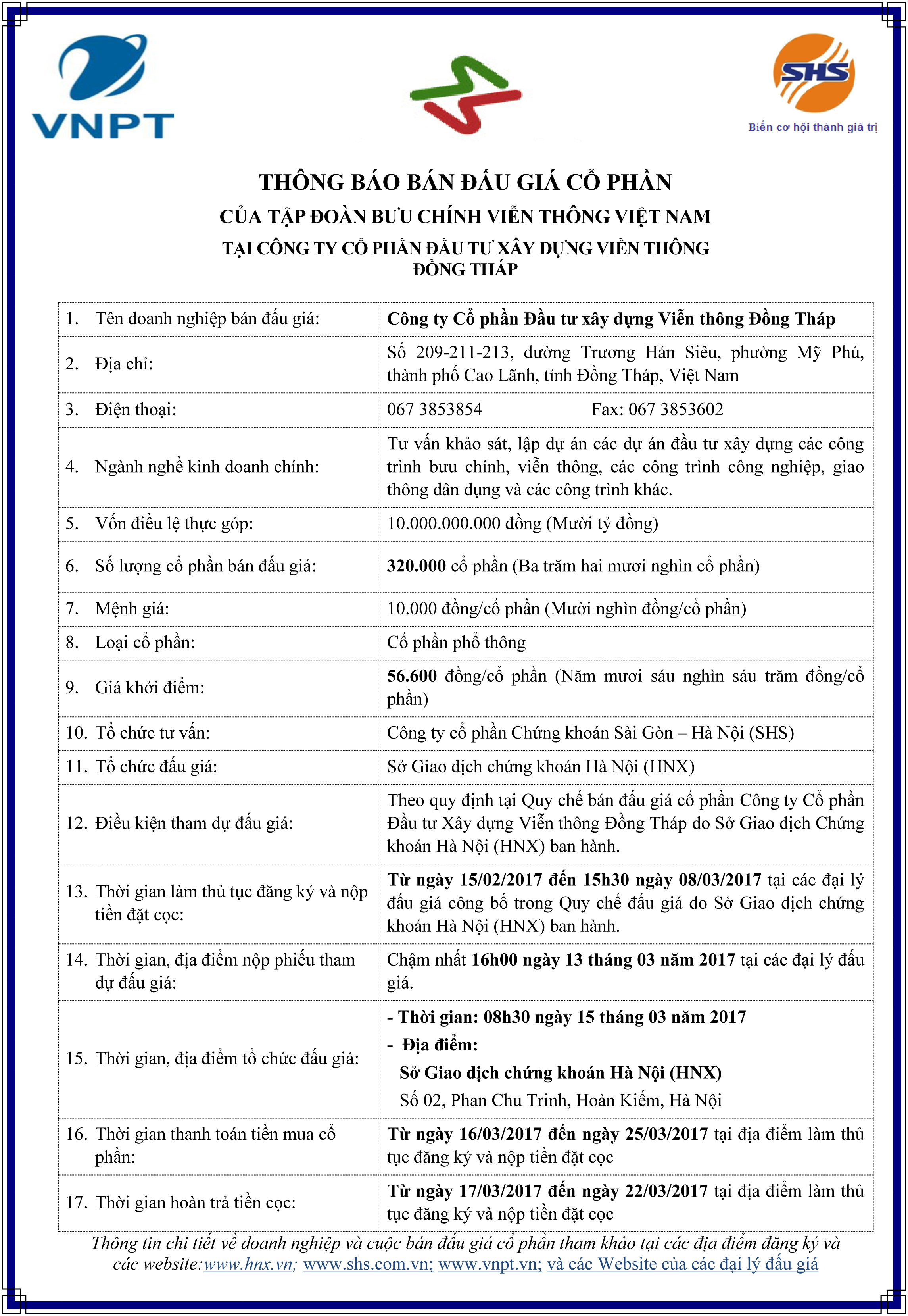- Thông báo đấu giá bán cổ phần ra công chúng của CTCP đầu tư xây dựng viễn thông Đồng Tháp do Tập đoàn bưu chính viễn thông Việt Nam sở hữu - 15/02/2017