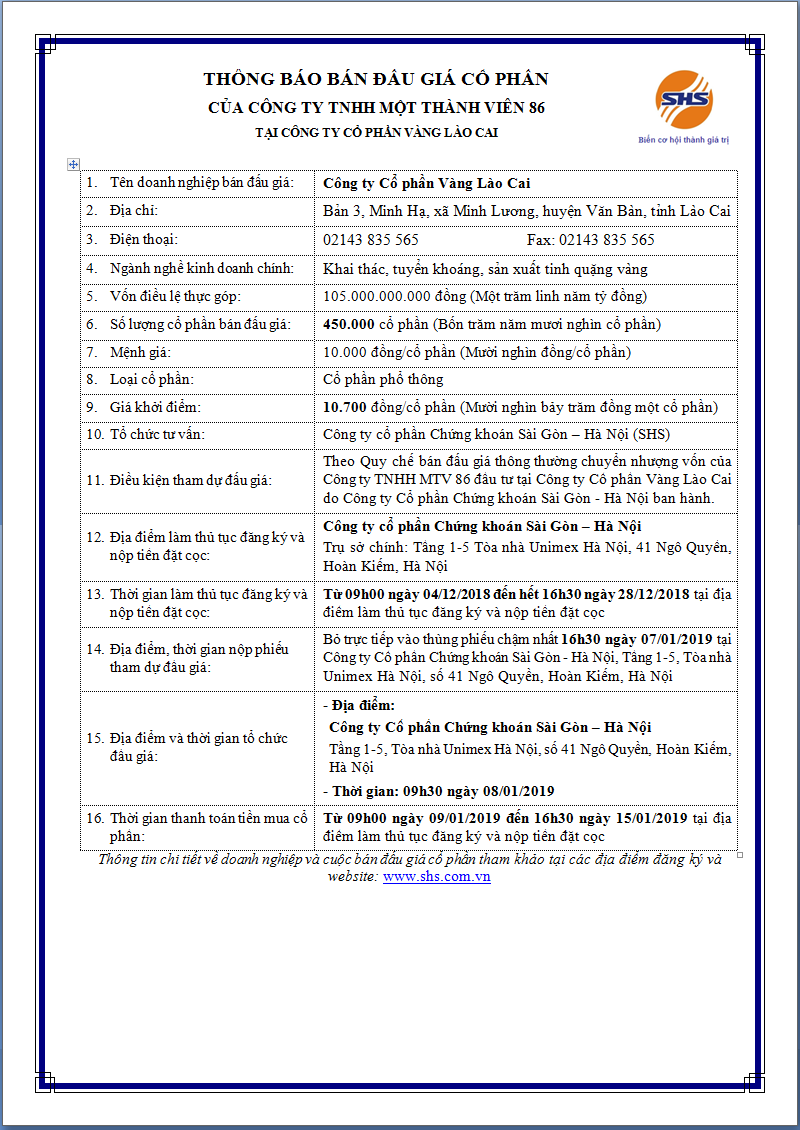 Thông báo bán đấu giá cổ phần của Công ty TNHH một thành viên 86 tại Công ty Cổ phần vàng Lào Cai