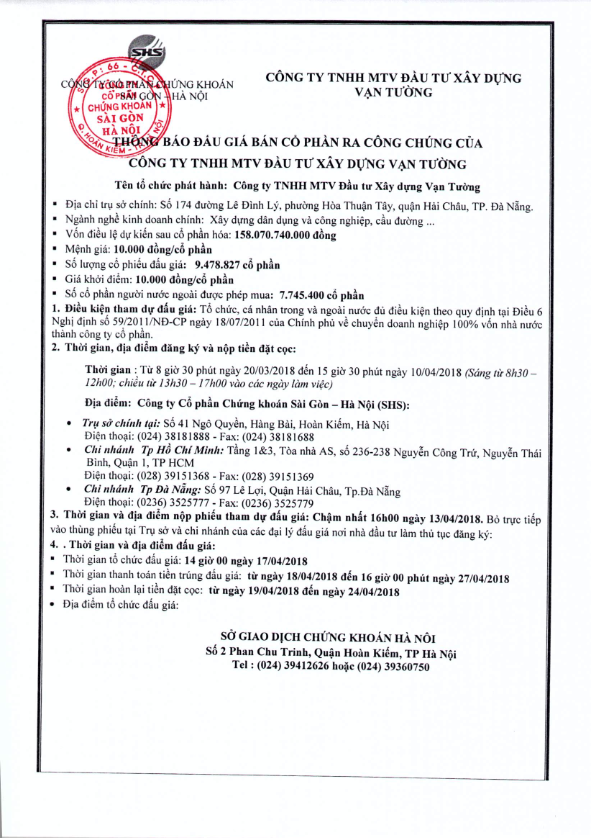 Thông báo bán đấu giá cổ phần của Công ty TNHH MTV Đầu tư Xây dựng Vạn Tường