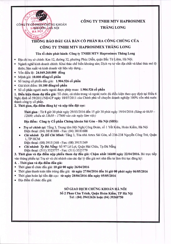 Thông báo bán đấu giá cổ phần của Công Ty TNHH MTV Haprosimex Thăng Long