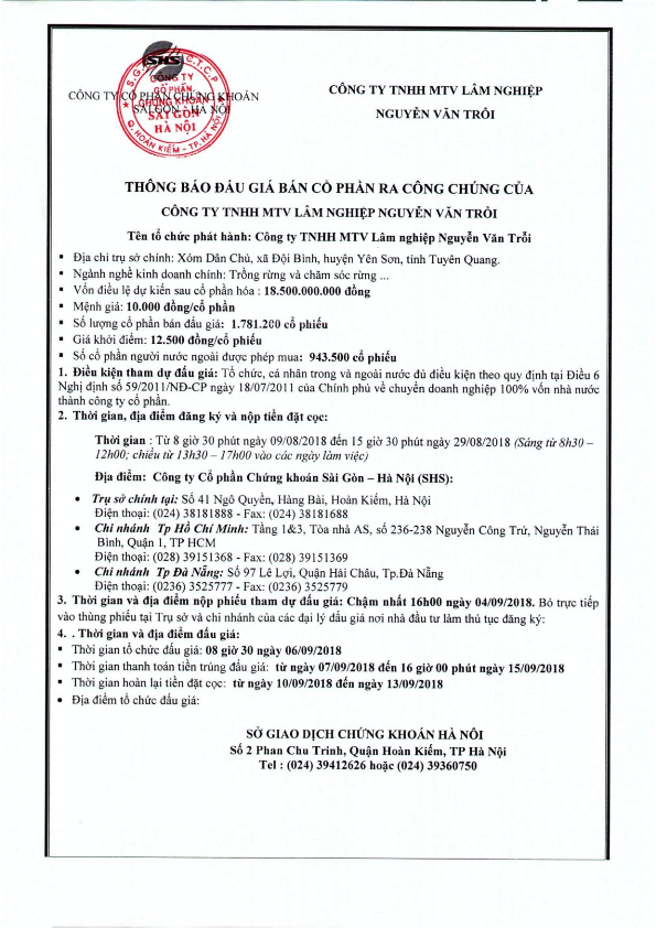 Thông báo bán đấu giá cổ phần của công ty TNHH MTV Lâm nghiệp Nguyễn Văn Trỗi