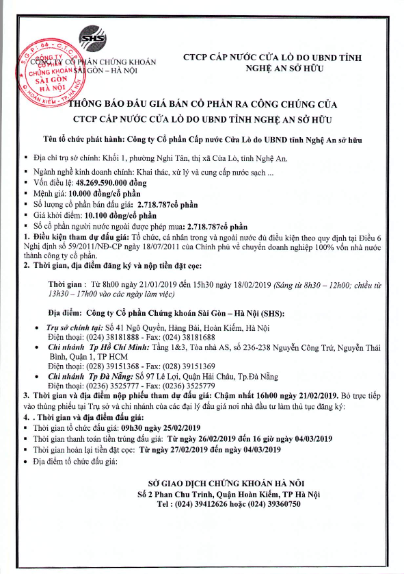 - Thông báo bán đấu giá cổ phần của CTCP cấp nước Thái Hòa do UBND tỉnh Nghệ An sở hữu - 21/01/2019