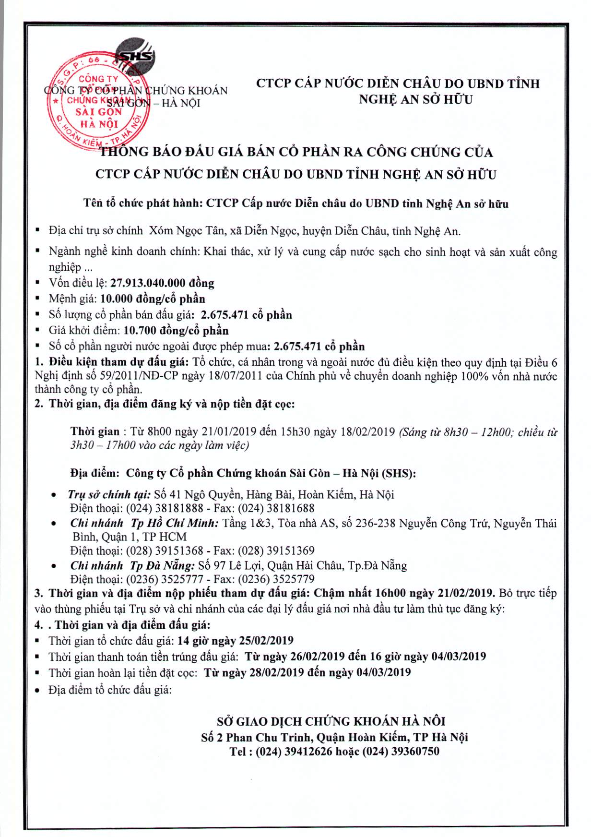Thông báo bán đấu giá cổ phần của CTCP cấp nước Diễn Châu do UBND tỉnh Nghệ An sở hữu
