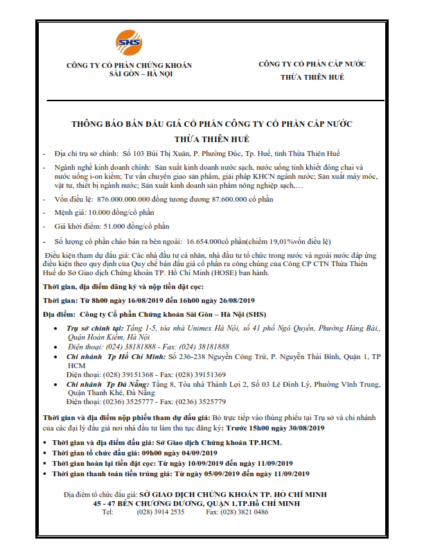 - THÔNG BÁO BÁN ĐẤU GIÁ CỔ PHẦN CTCP CẤP NƯỚC THỪA THIÊN HUẾ - 16/08/2019