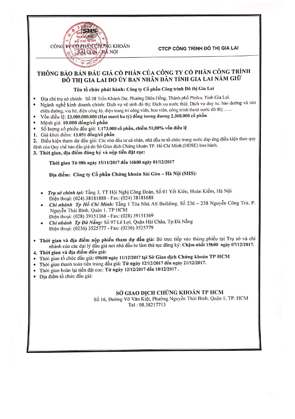Thông báo bán đấu giá cổ phần của CTCP Công trình đô thị Gia Lai do UBND Tỉnh Gia Lai nắm giữ