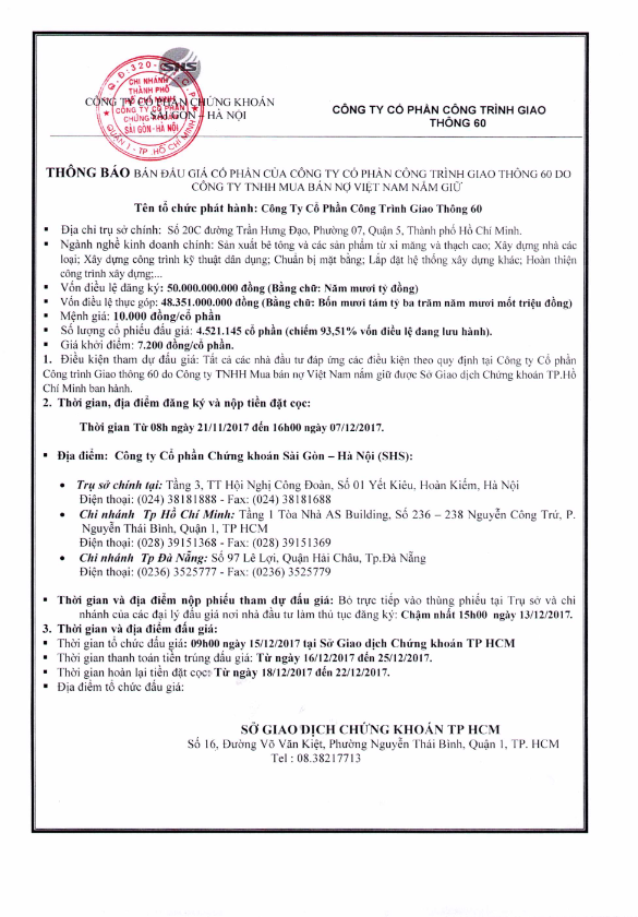 Thông báo bán đấu giá cổ phần của CTCP Công trình Giao thông 60 do công ty TNHH Mua bán nợ Việt Nam nắm giữ