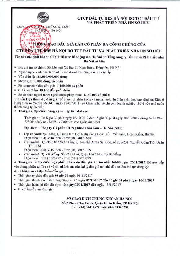 Thông báo bán đấu giá cổ phần của CTCP Đầu tư Bất động sản Hà Nội do TCT Đầu tư và Phát triển nhà Hà Nội sở hữu