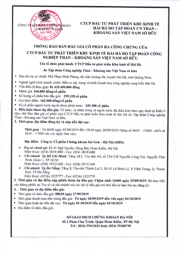 - Thông báo bán đấu giá cổ phần của Tập đoàn Công nghiệp Than - Khoáng sản Việt Nam tại CTCP Đầu tư phát triển Khu kinh tế Hải Hà - 03/09/2019